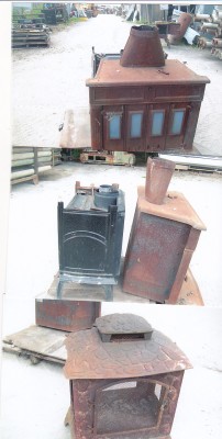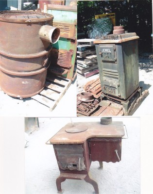 Des vieux poêles de toutes sortes. Extérieur ou intérieur pour usage spécial. Il y en a plusieurs. Aussi non illustré, une grosse fournaise suprême au bois.