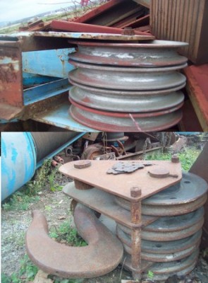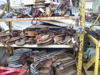 En inventaire, un bon nombre de poulies de plusieurs catégories et forces. Poulies seuls, simple avec crochet, double, triple et quadruple. Des shives de grues, des têtes de cheve. J'ai aussi un très grand assortiment de câbles, chaines et cordes.
