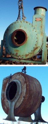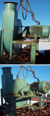 Un souffleur à brins de scie entré 12 pouces et sortie 6 pouces. Il a 6 palettes extra-robustes pour brins de scie ou coupeaux. Moteur 30 HP. Aussi un autre ventilateur avec une entré de 20 pouces, sortie de 17"x17" pouces, 6 palettes extra-robustes.